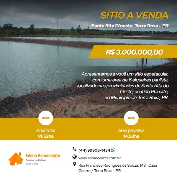 Apresentamos a você um sítio espetacular, com uma área de 6 alqueires paulista, localizado nas proximidades de Santa Rita do Oeste, sentido Planalto, no Município de Terra Roxa, PR. Este é o lugar perfeito para aqueles que desejam viver em harmonia com a natureza e desfrutar de todas as maravilhas que o campo tem a oferecer.